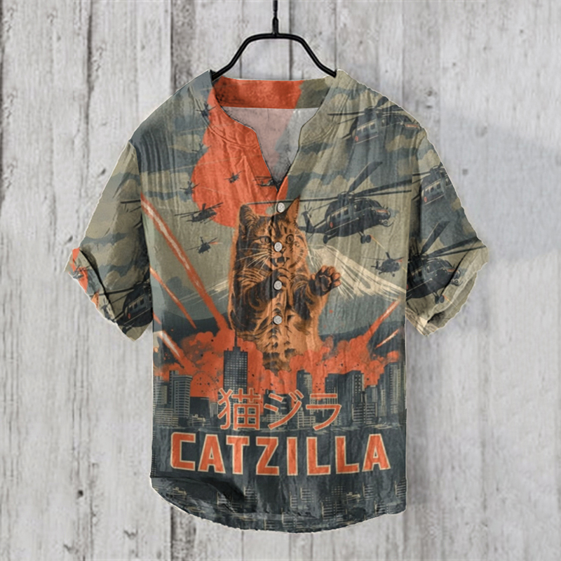 Abstract Creative Catzilla City Japanese Art Pattern Linen Blend Shirt