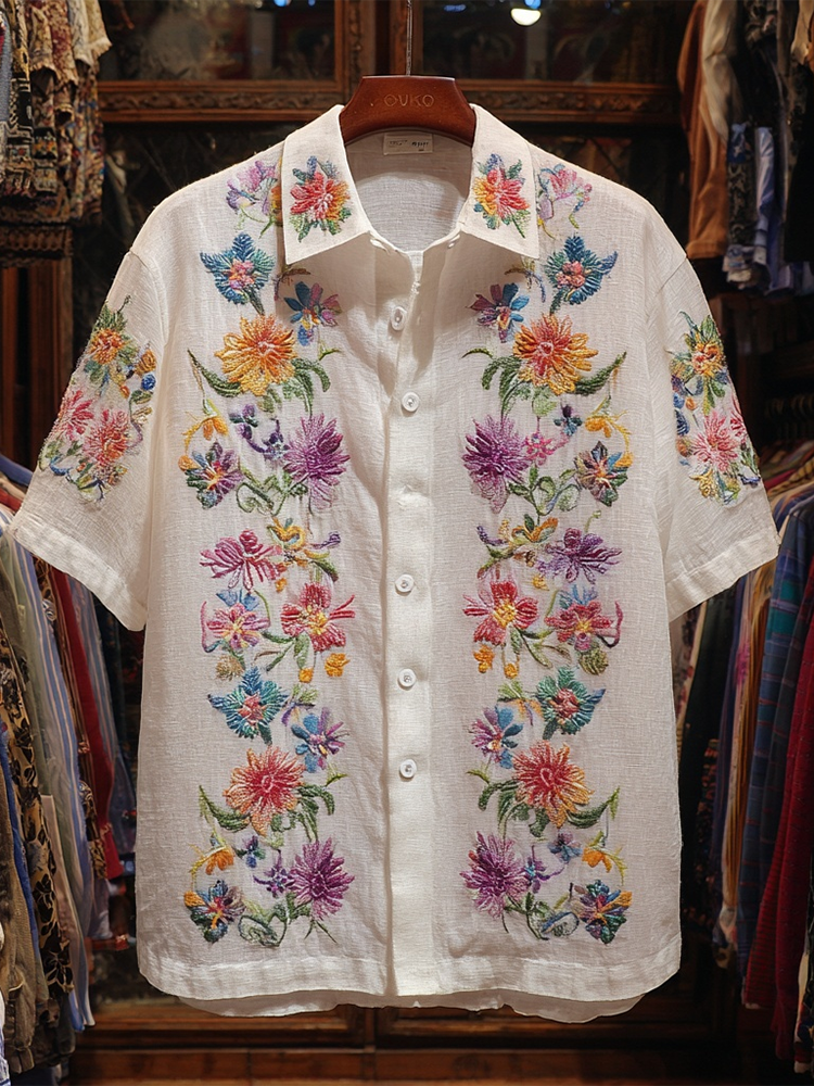 Bohemian Style Three-dimensional Embroidered Flowers, Vintage Linen, Lonesome White Men's V-neck Short-sleeved Shirt