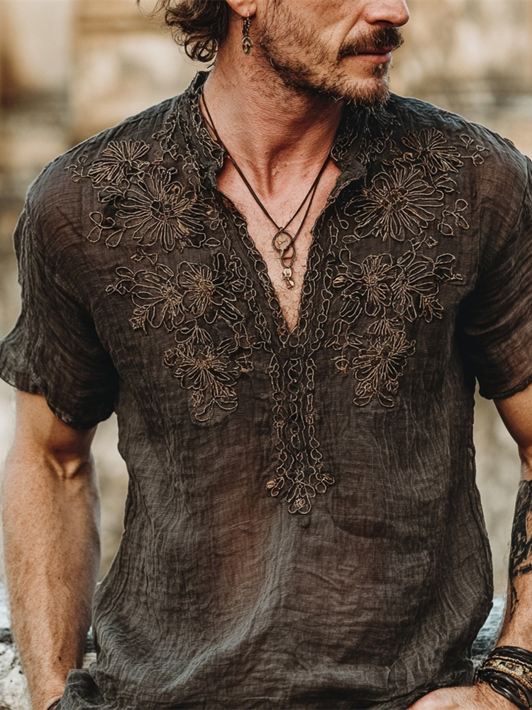Boho Vintage Floral Embroidery Men's Linen Short Sleeve Shirt