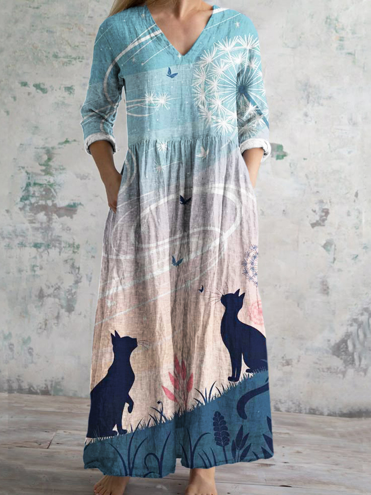 Butterfly & Cat Element Printed Women's V-neck Linen Maxi Dress