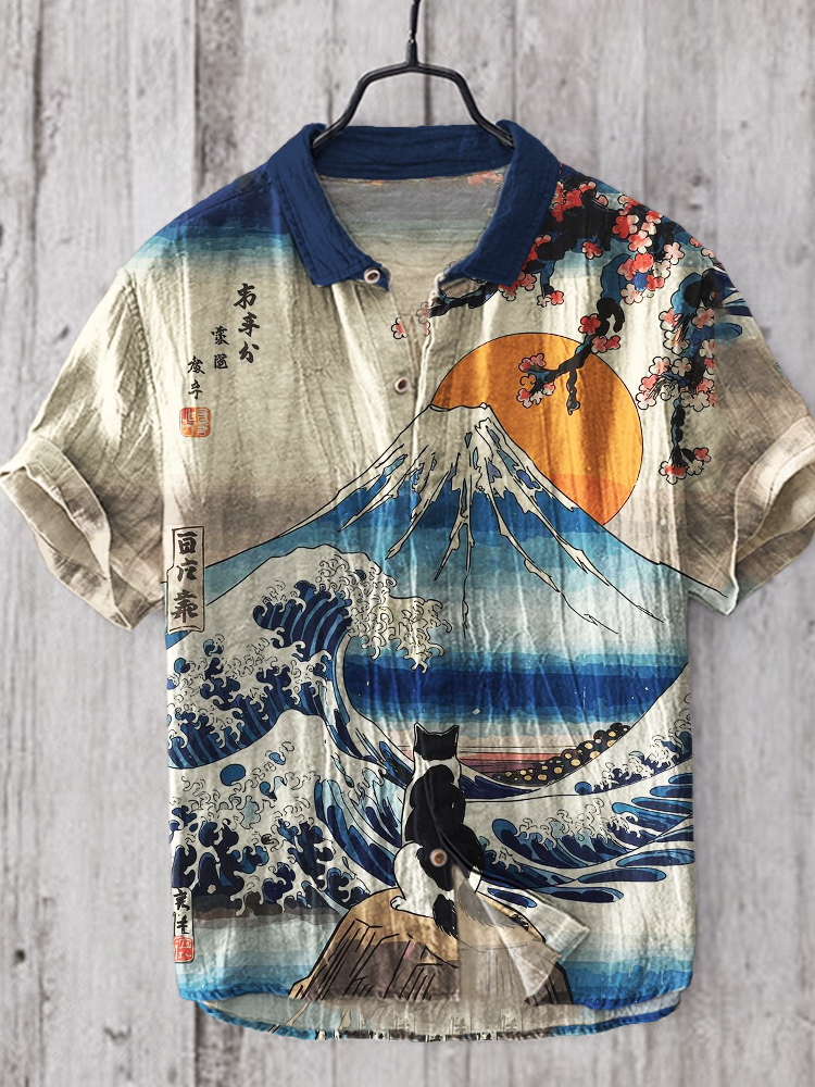Cat & Mount Fuji Sea Waves Sunrise Japanese Art Linen Shirt