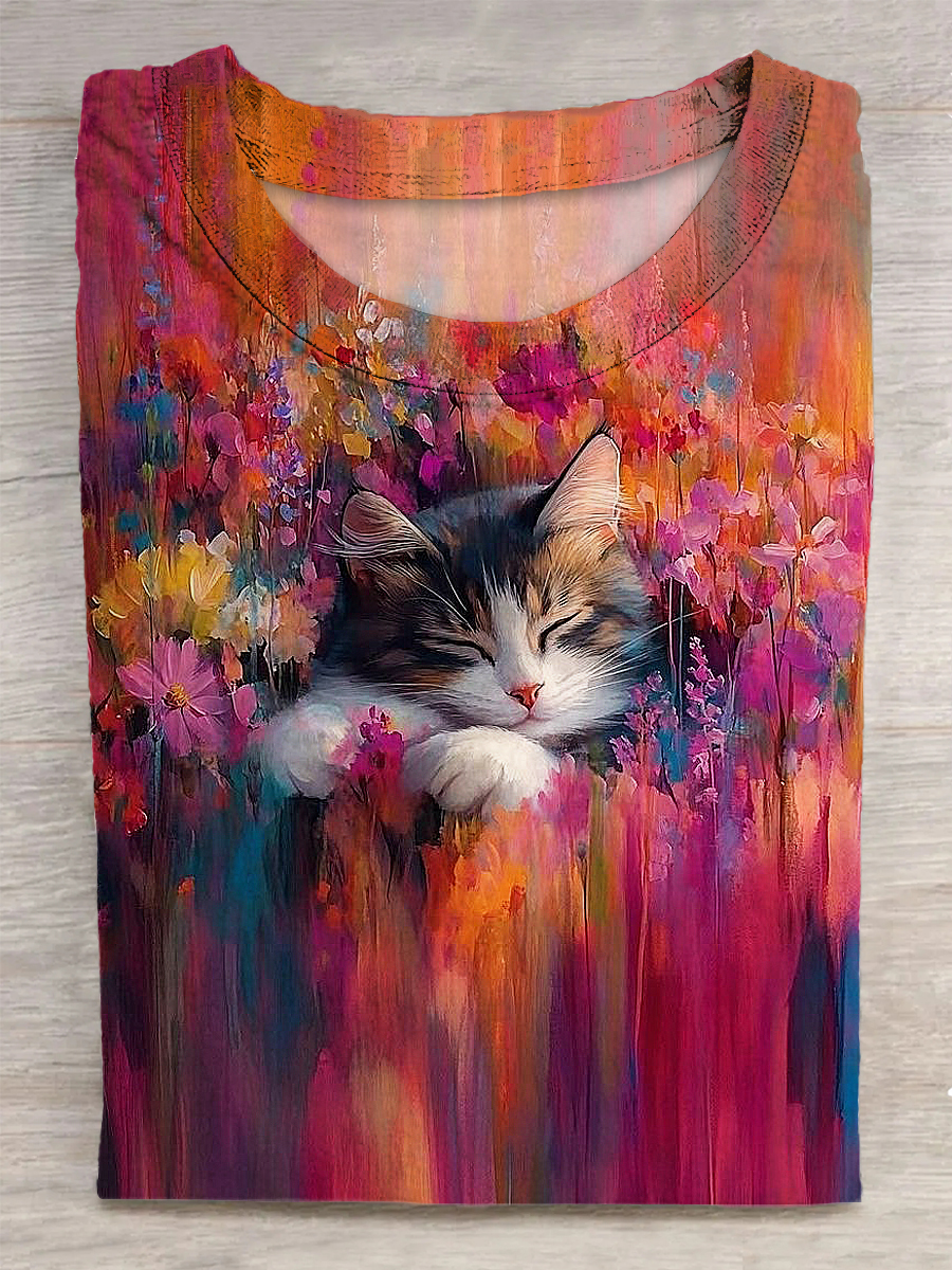 Cat Printed Vintage Fashion Loose Short Sleeve T-Shirt