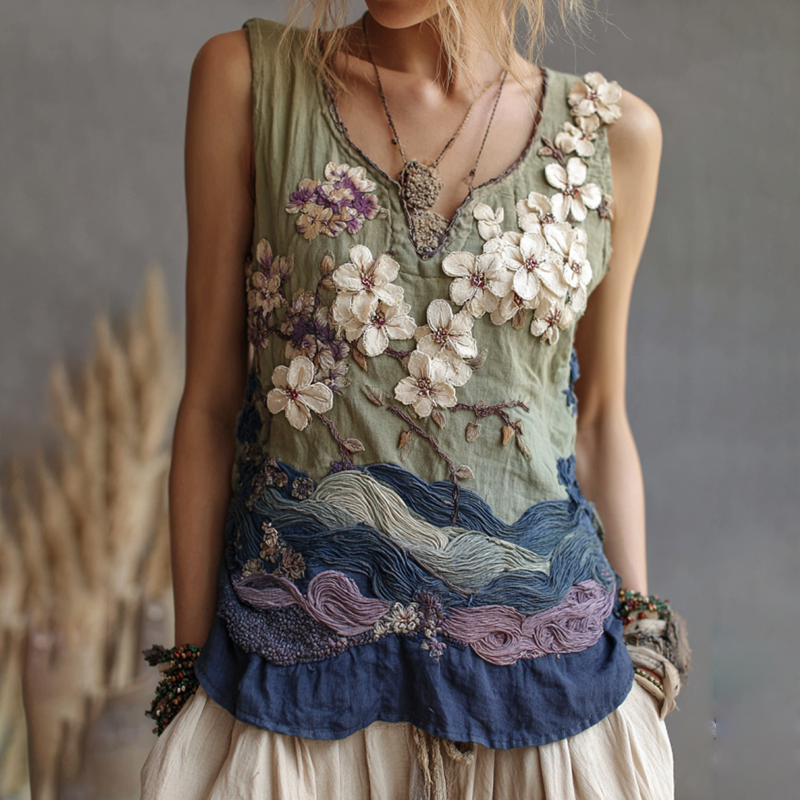 Classy Gradient Japanese Sakura Cherry Blossoms And Sea Wave Embroidered Pattern Linen Tank Top