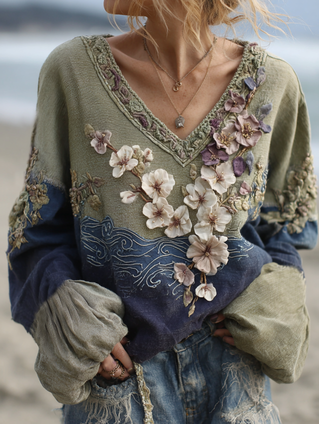 Classy Vintage Gradient Japanese Sakura Cherry Blossoms Embroidered Linen V Neck Long Sleeve Shirt