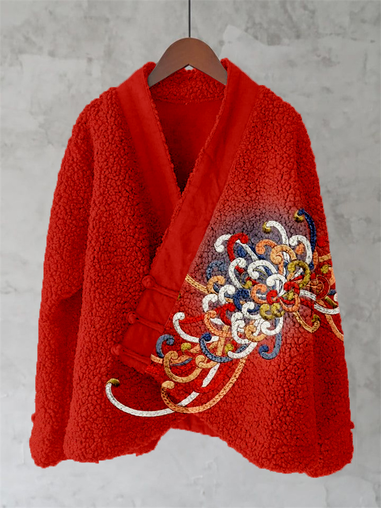 Embroidered Japanese Flower Art Fleece Kimono Cardigan
