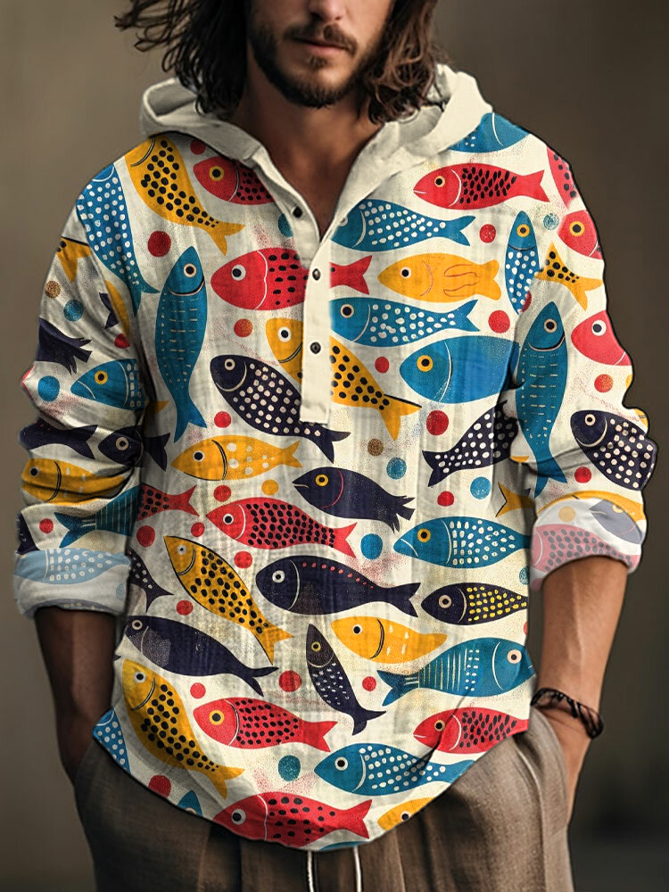 Fish Art Print Linen Blend Hooded Shirt