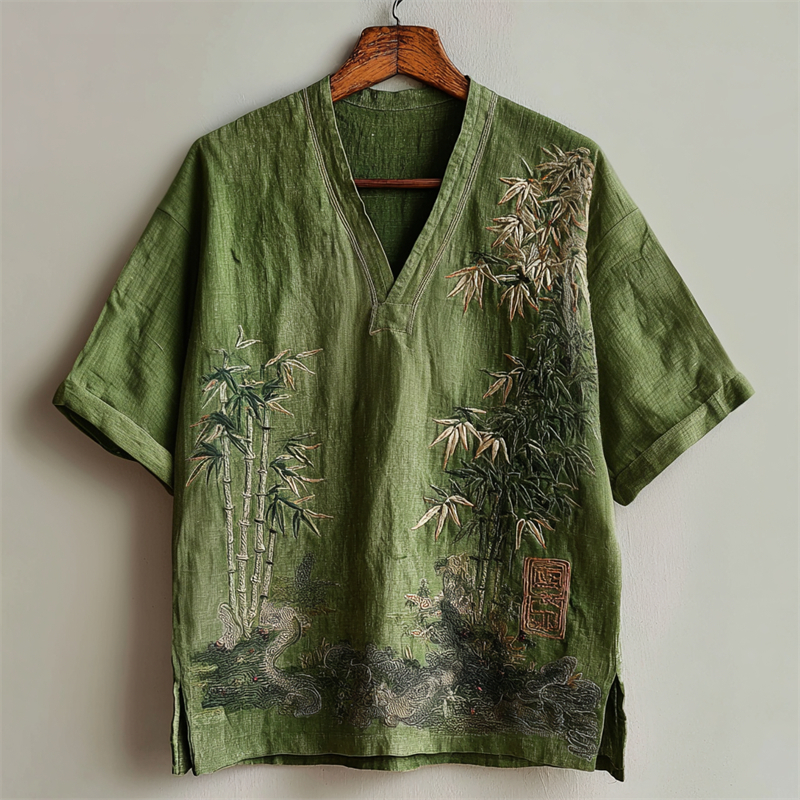 Japanese Bamboo & Pine Tree Embroidered Linen Shirt