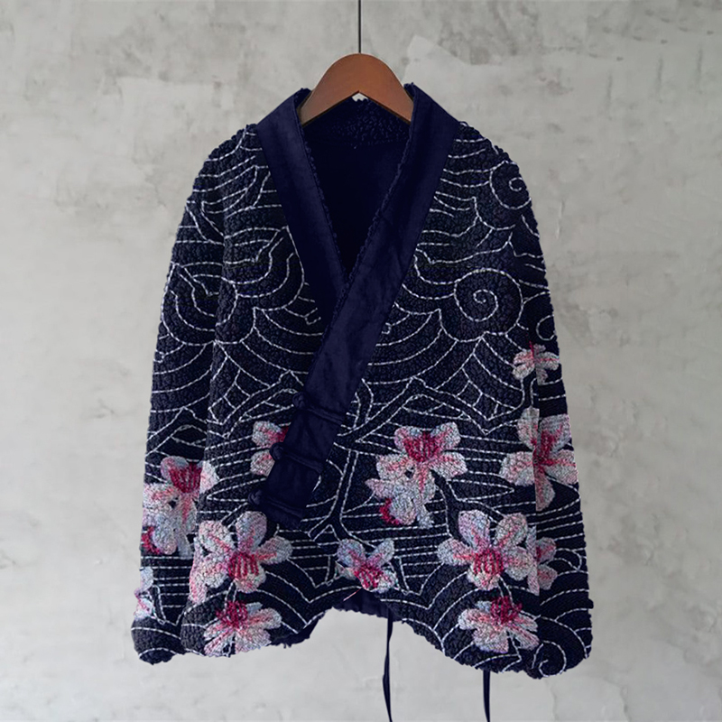 Japanese Cherry Blossom Line Embroidery Print Women'S Kimono Cardigan