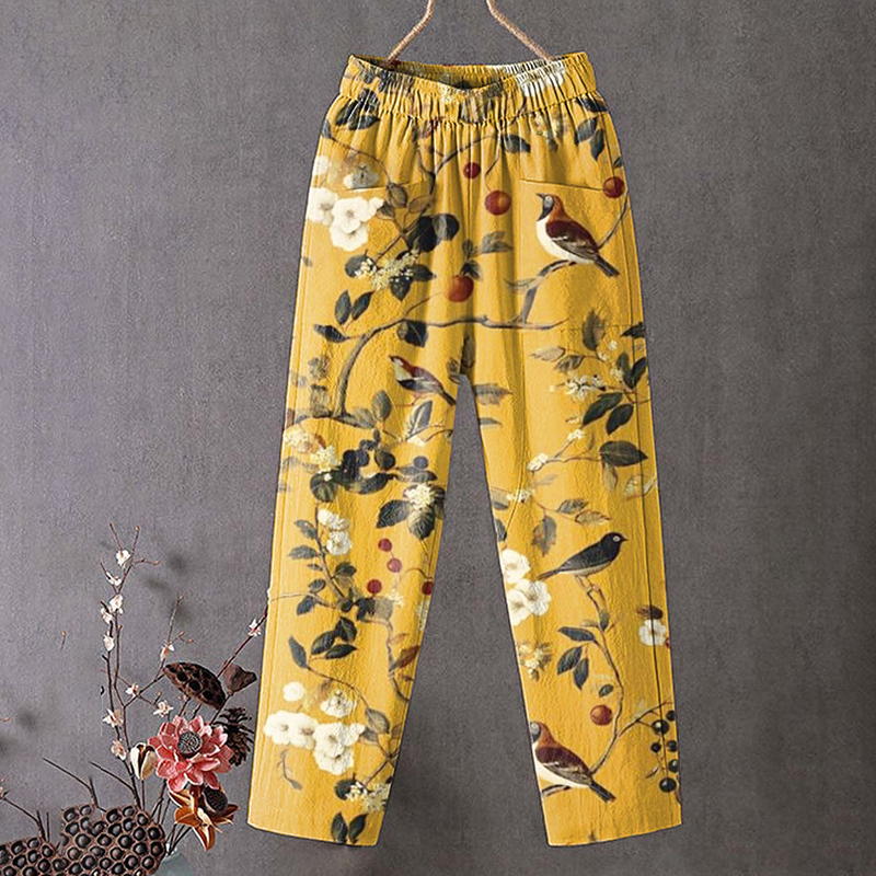 Japanese Flower And Bird Art Print Linen Blend Casual Pocket Pants