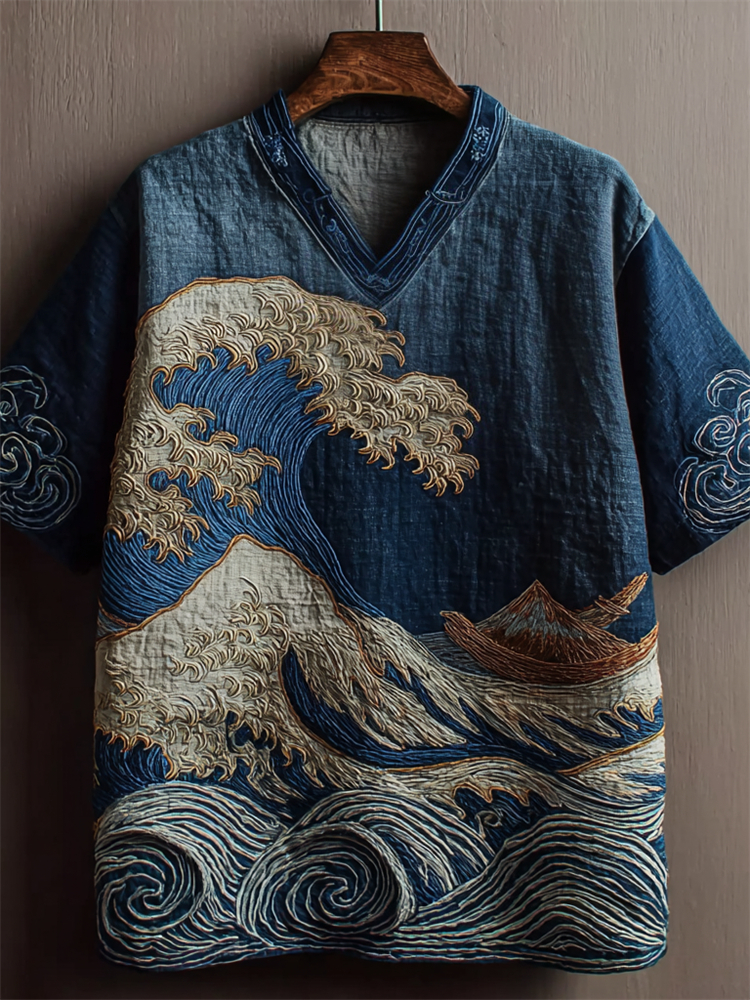 Japanese Great Sea Wave Embroidered Washed Linen Shirt