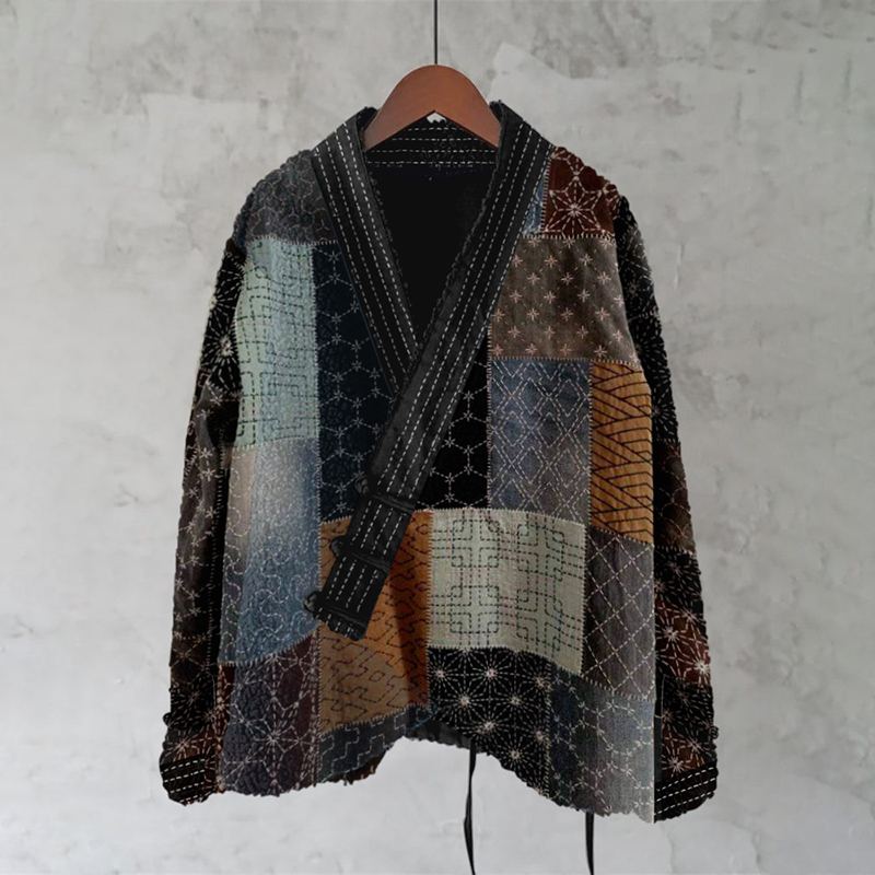 Japanese Sashiko Geometric Patchwork Pattern Women's Kimono