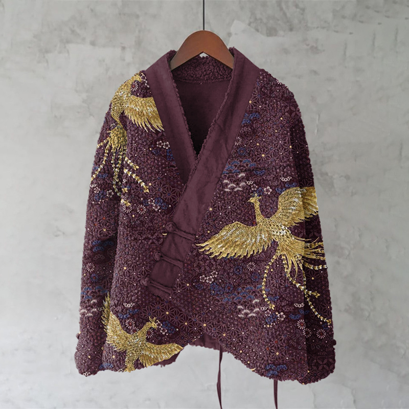 Japanese Style Gold Stamped Phoenix Art Pattern Plush Kimono Cardigan