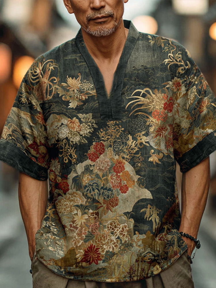 Japanese-style Pressed Gold, Fresh Flower, Cloud Embroidery, Printed V-neck Men's Short-sleeved Shirt