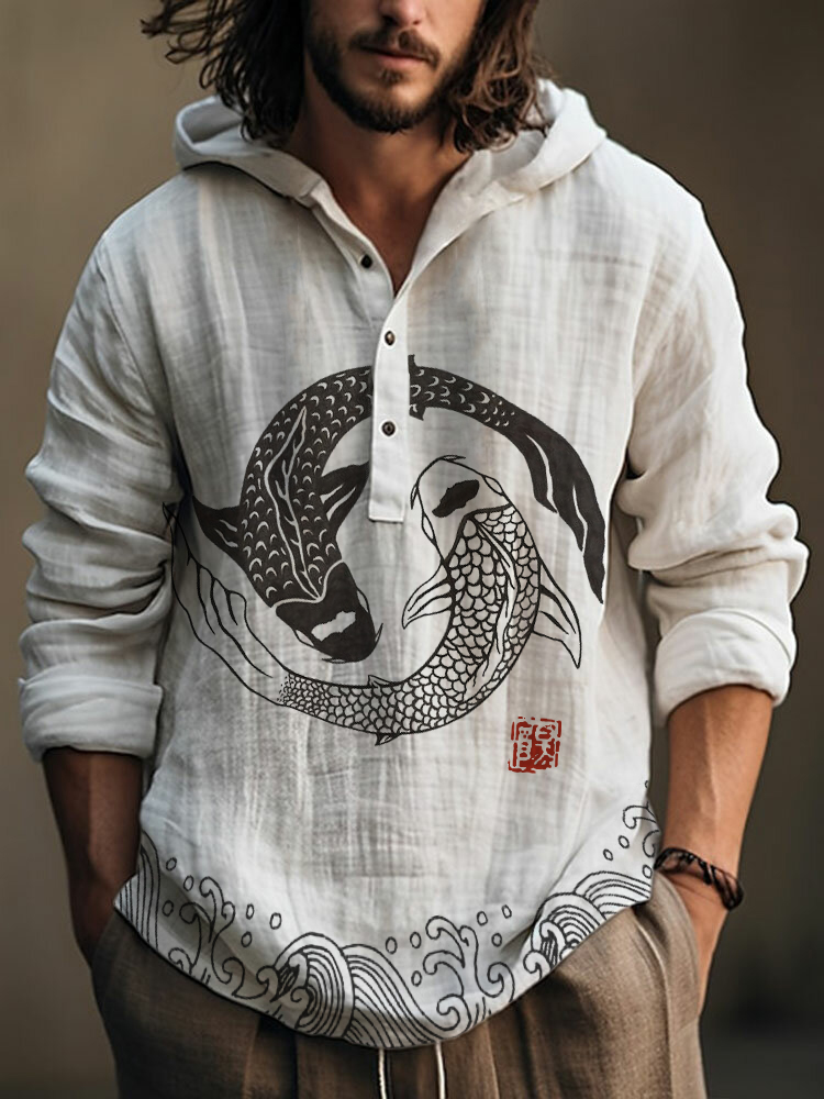 Koi Fish Sea Waves Japanese Art Linen Blend Hooded Shirt