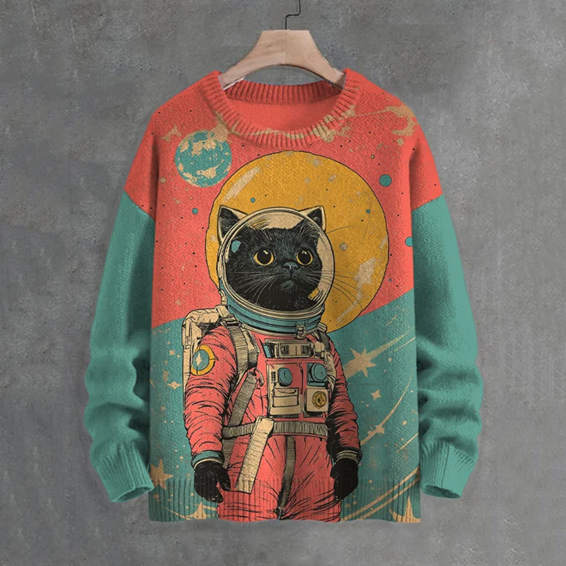 Men's Black Cat Astronaut Color Block Art Print Knit Crew Neck Sweater