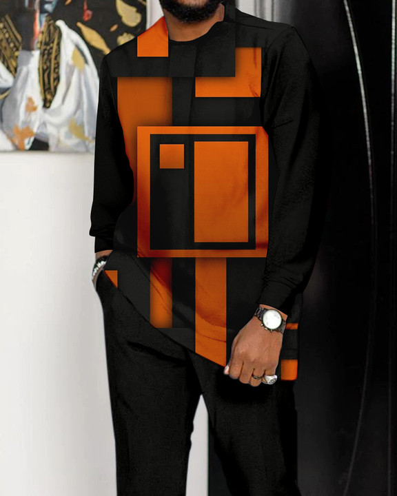 Men's Black Chain Stripe Print Long Sleeve Athletic Walking Suit -332