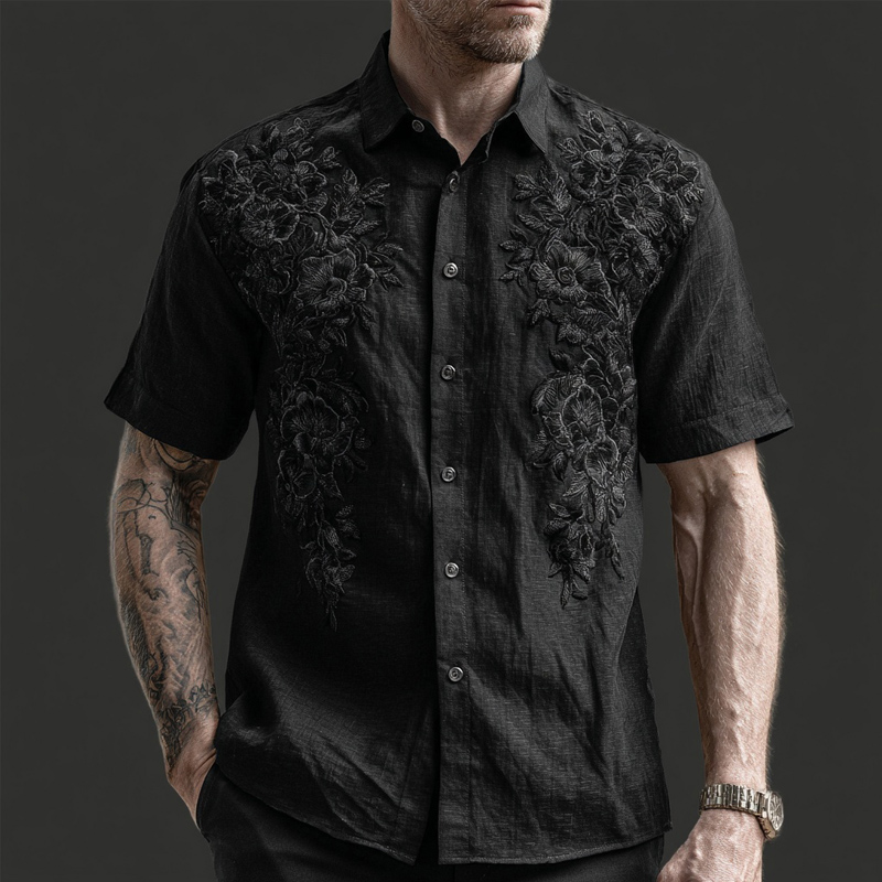 Men's Black Floral Lace Embroidered Short Sleeve Linen Shirt