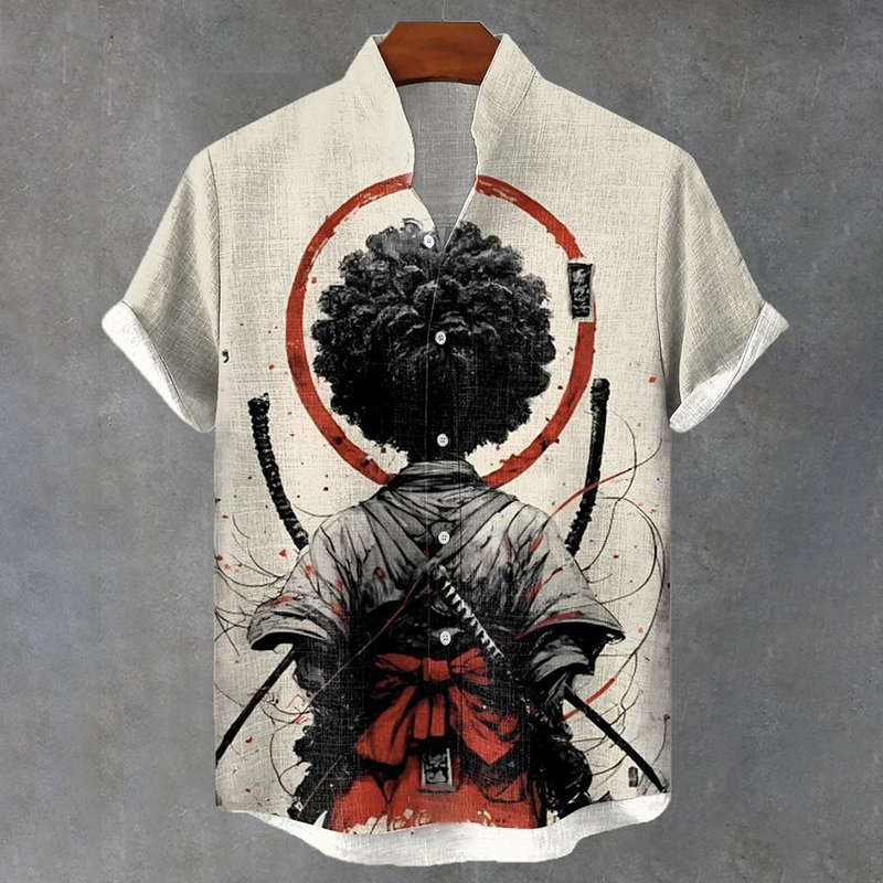 Men's Black Japanese Samurai Back Ink Painting Art Linen Blend Cozy Shirt
