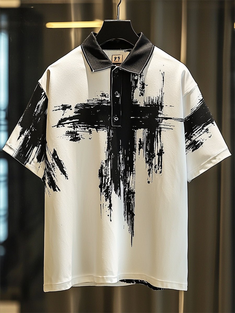 Men's Business Casual Cross Print Button Short Sleeve Polo Shirt