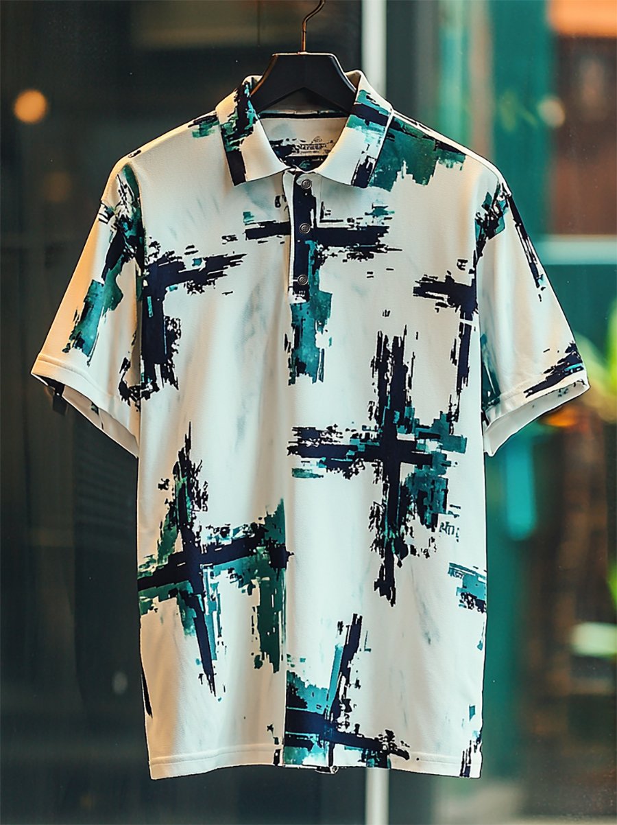 Men's Business Casual Cross Print Button Short Sleeve Polo Shirt