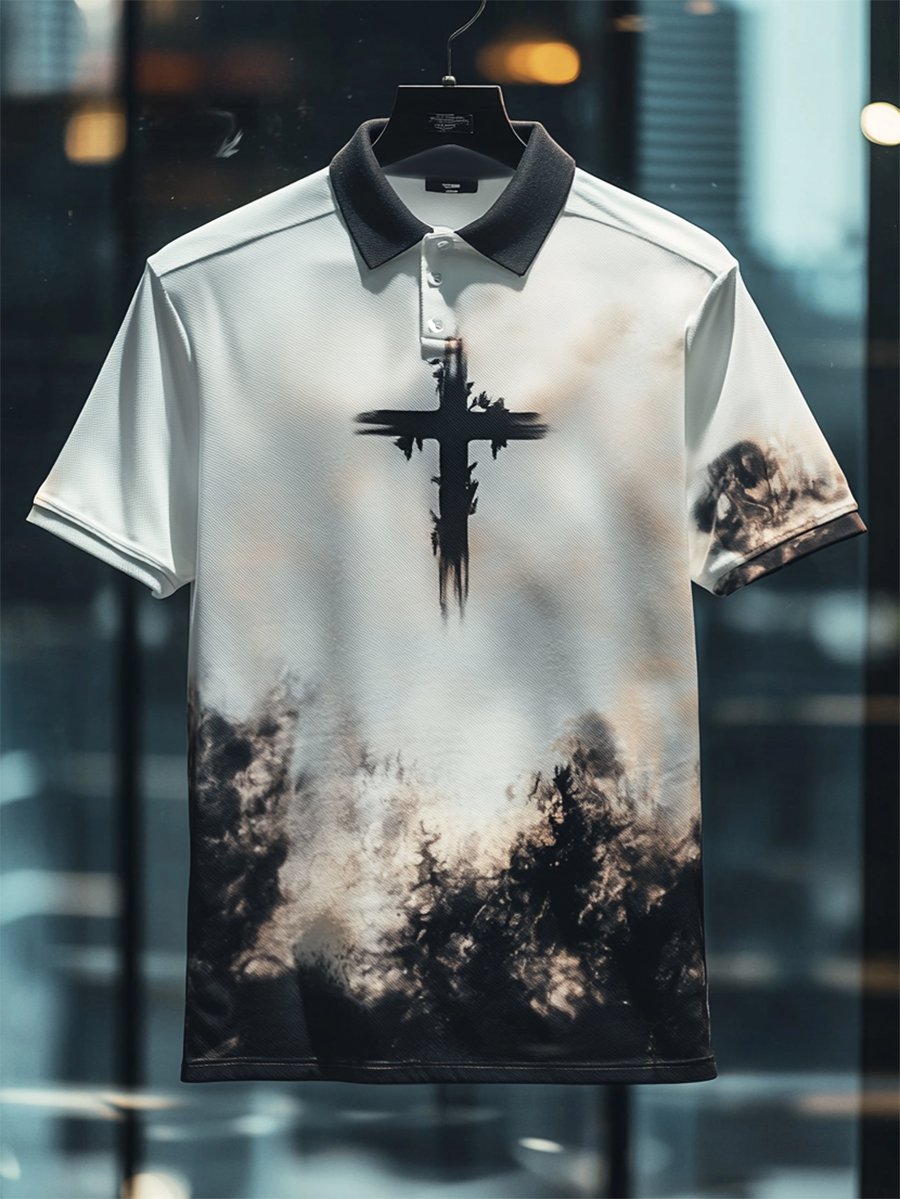 Men's Business Casual Cross Print Button Short Sleeve Polo Shirt