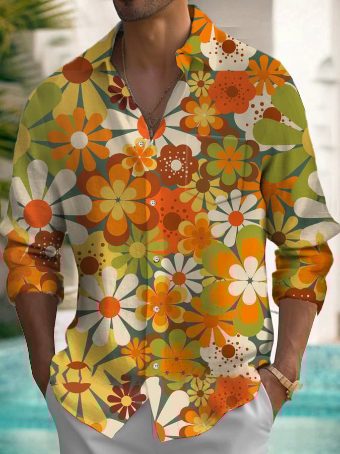 Men's Floral 70s Retro Long Sleeve Shirt With Pockets
