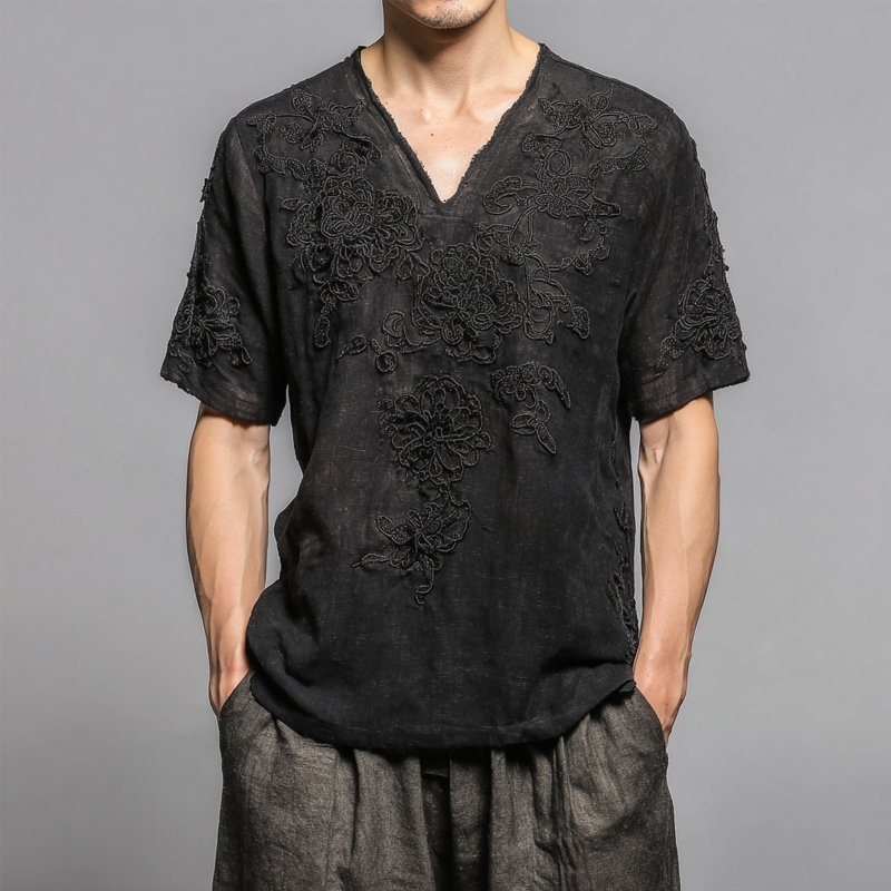 Men's Floral Lace Embroidered Vintage Linen T Shirt