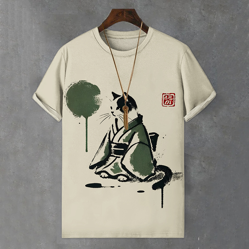Men's Japanese Hot Black Cat Art Print Comfortable T-shirt