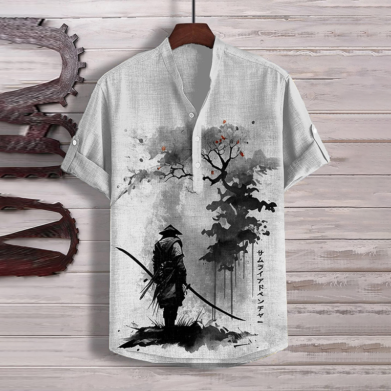 Men's Japanese Samurai Ink Art Print Half Button Shirt