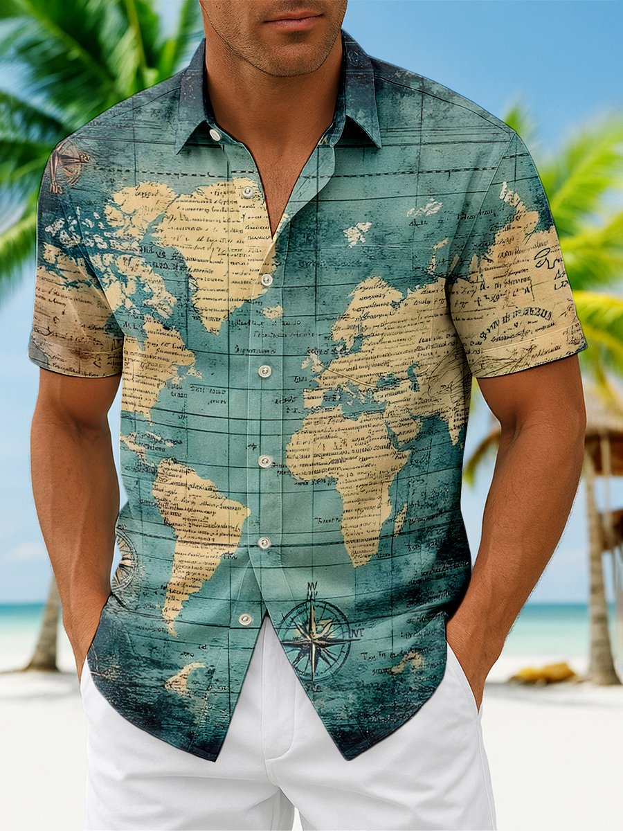 Men's Lapel Map Print Personalized Short Sleeve Shirt