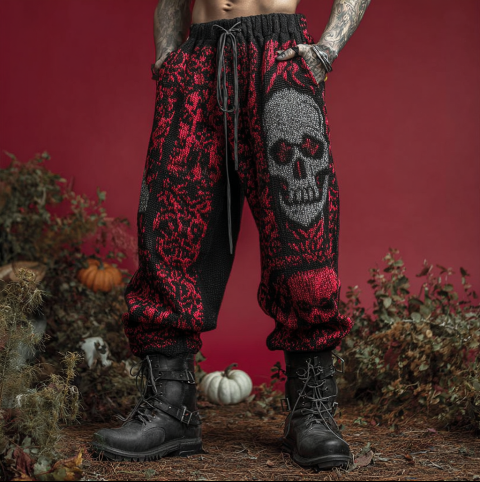 Men's Loose Knit Casual Long Pants With Dark Gothic Style Skull And Floral Elements For Halloween
