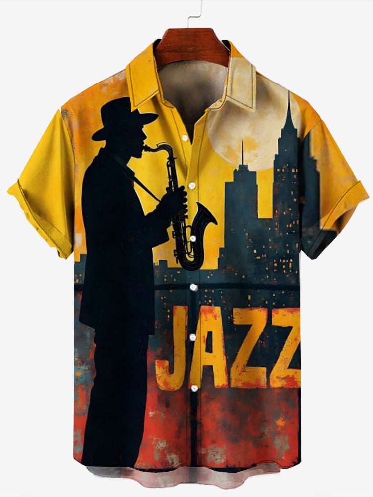 Men's Music Print Turndown Collar Short Sleeve Shirt