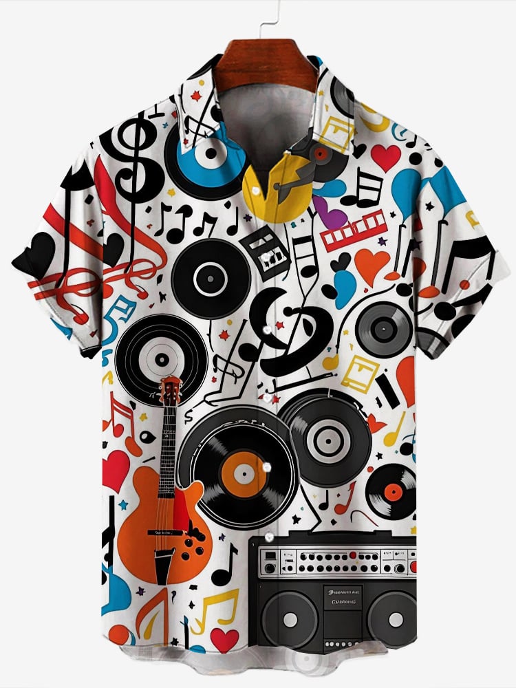 Men's Music Print Turndown Collar Short Sleeve Shirt