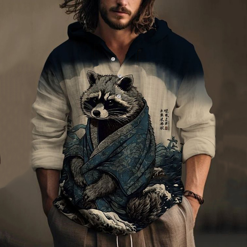 Men's Raccoon Rough Sea Waves Japanese Art Print Linen Blend Hoodie