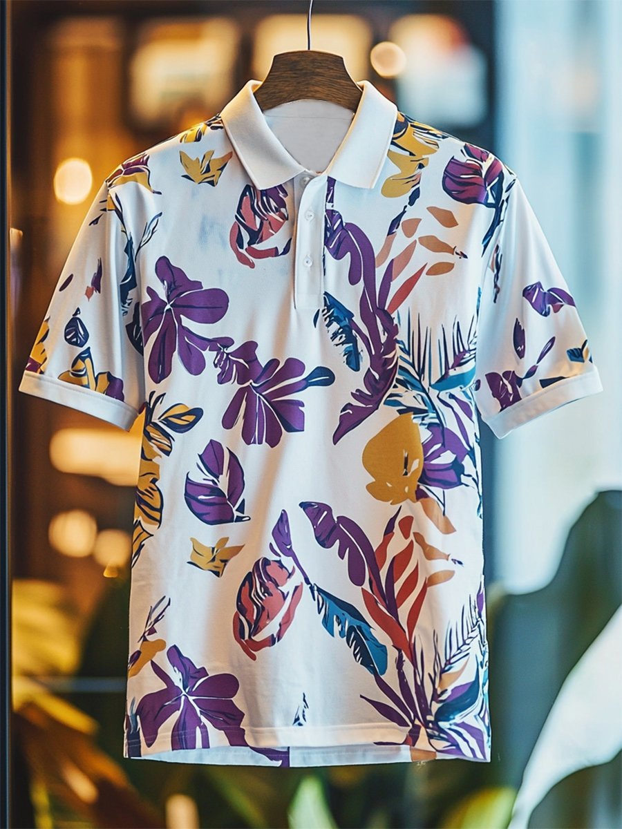 Men's Resort Flora Print Button Short Sleeve Polo Shirt