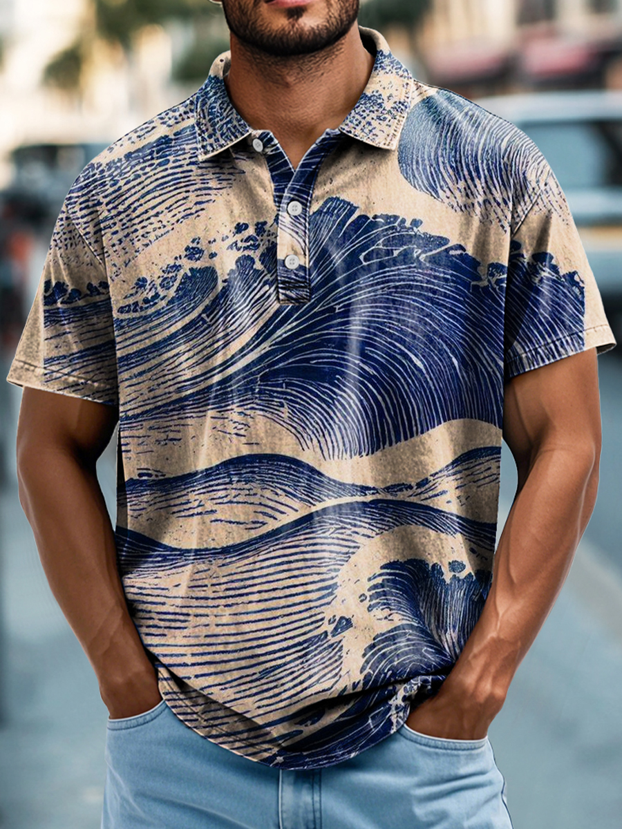 Men's Retro Abstract Line Wave Print Casual Short Sleeve Polo Shirt