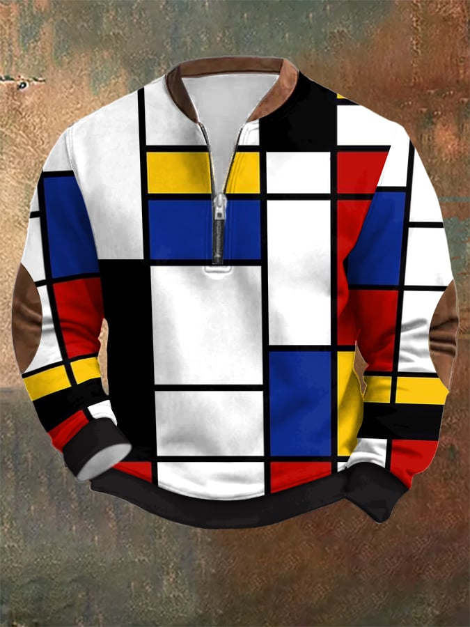 Men's Retro Mondrian Color Block Print Zip Collar Sweatshirt