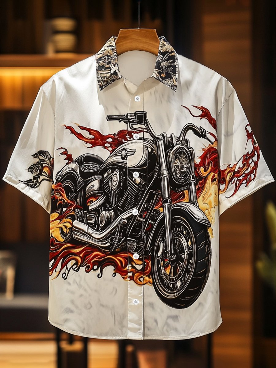 Men's Retro Motorcycle Print Lapel Short Sleeve Shirt