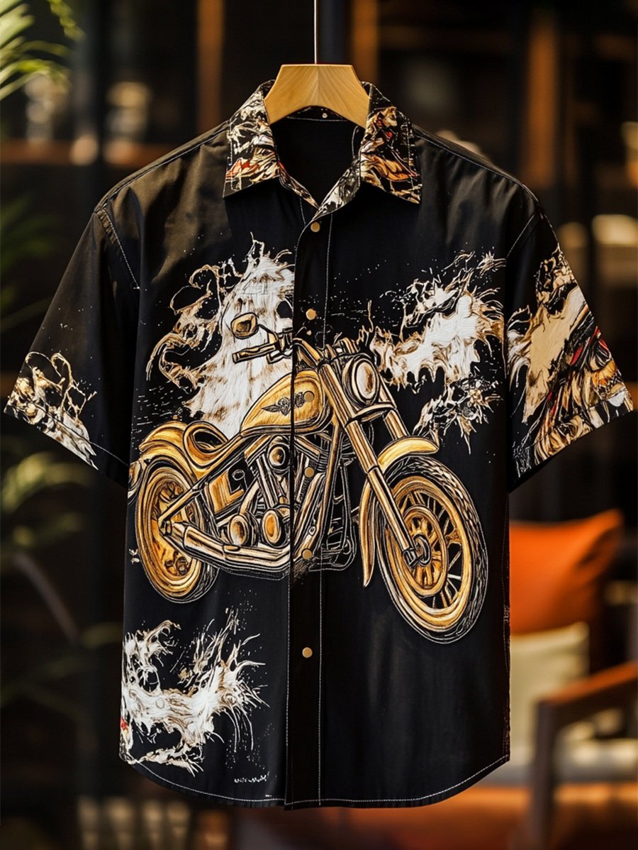 Men's Retro Motorcycle Print Lapel Short Sleeve Shirt