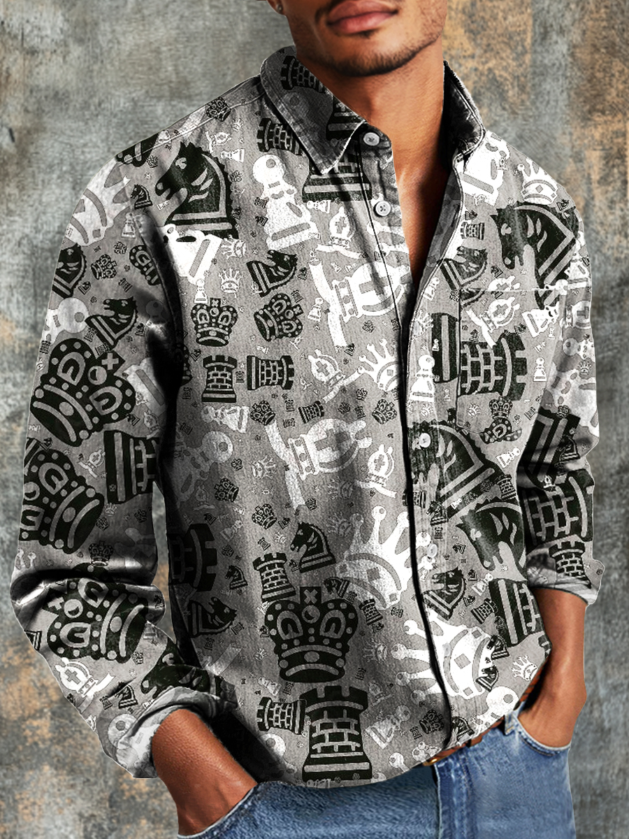Men's Vintage Abstract Chess Pattern Long Sleeve Pocket Shirt