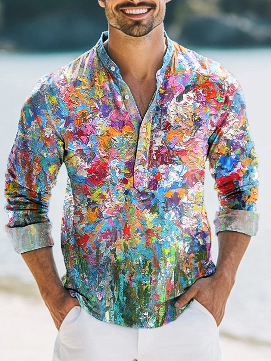 Men's Vintage Abstract Color Acrylic Art Print Long Sleeve Henley Shirt