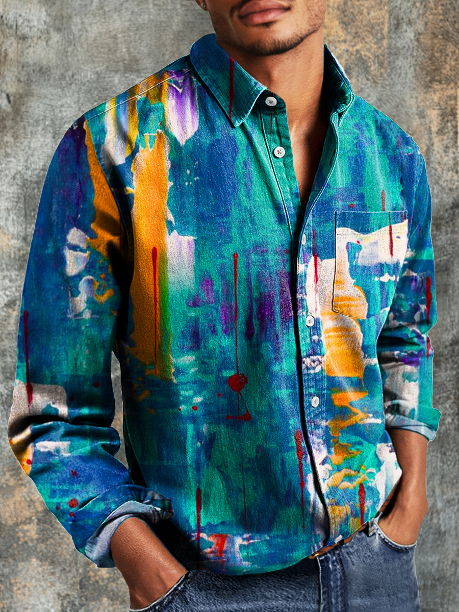 Men's Vintage Abstract Color Art Print Long Sleeve Pocket Shirt