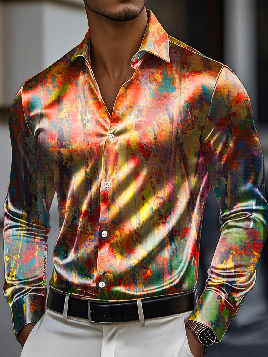 Men's Vintage Abstract Color Art Print Premium Satin Long Sleeve Shirt