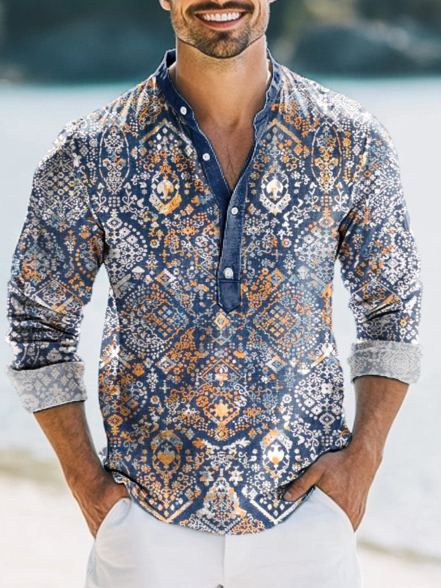 Men's Vintage Abstract Ethnic Geometric Art Print Long Sleeve Henley Shirt