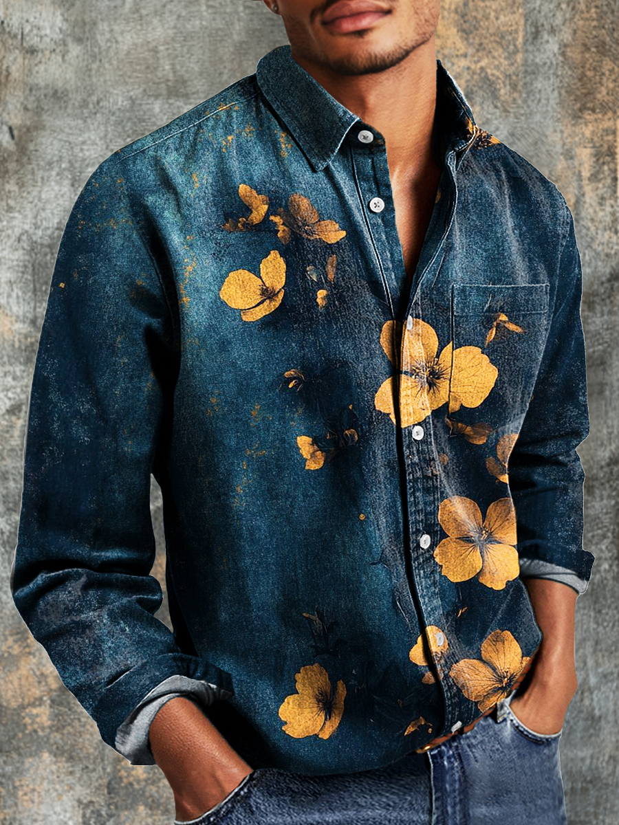 Men's Vintage Abstract Floral Art Print Casual Long Sleeve Shirt