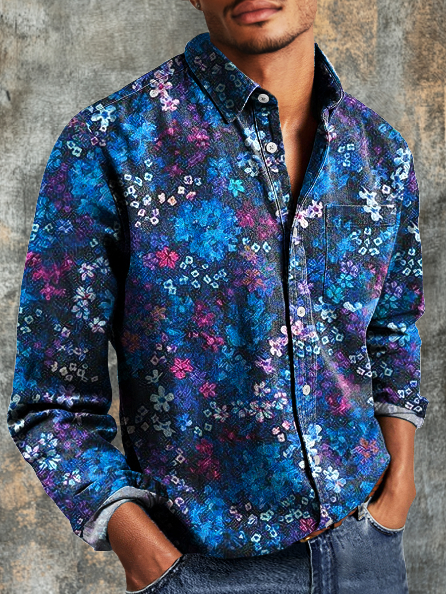 Men's Vintage Abstract Floral Art Print Long Sleeve Pocket Shirt