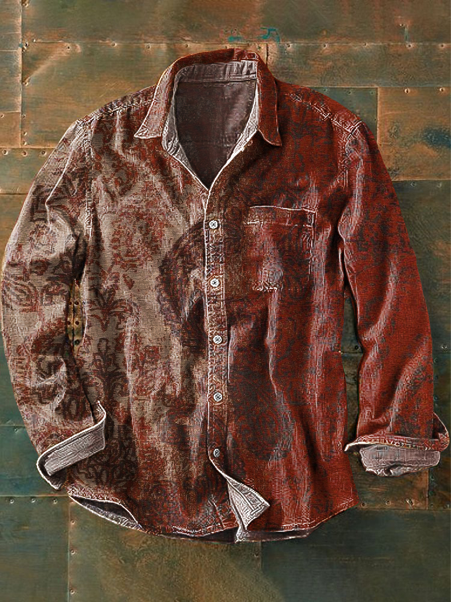 Men's Vintage Abstract Floral Art Print Long Sleeve Pocket Shirt