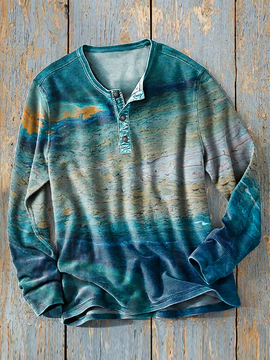 Men's Vintage Abstract Gradient Textured Art Print Long Sleeve Henley Shirt