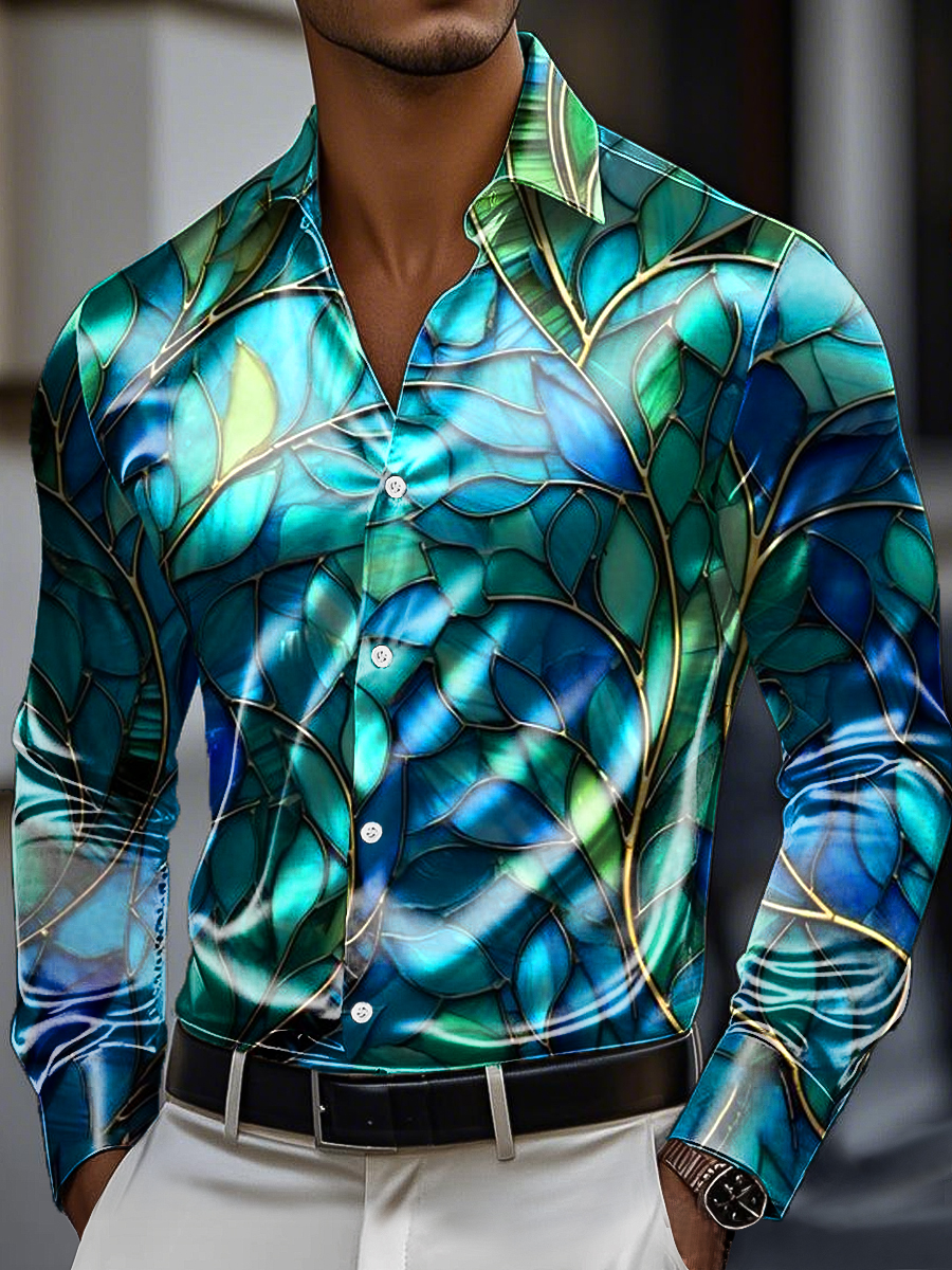 Men's Vintage Abstract Leaf Art Print Premium Satin Long Sleeve Shirt