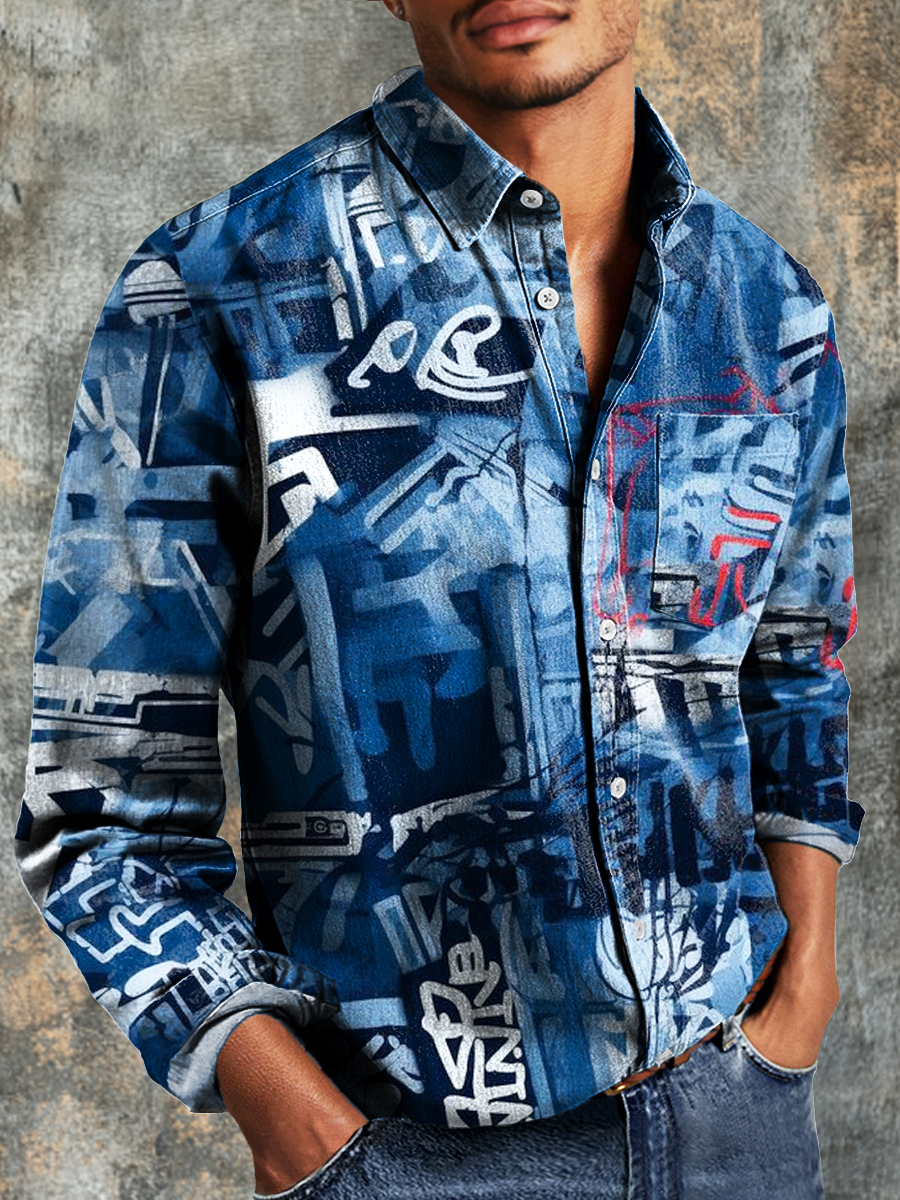 Men's Vintage Abstract Line Letter Art Print Long Sleeve Pocket Shirt